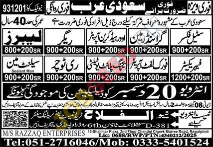 M/S Razzaq Enterprises is seeking qualified individuals for various positions in Saudi Arabia. Candidates should be below 40 years of age. The available roles include skilled and experienced professionals in various fields.