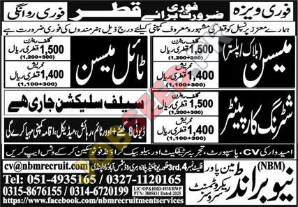 New Brand Manpower, Doha Qatar Pakistan invites applications from eligible candidates for the post of Tile Mason (Block Plaster) and Shuttering Carpenter as per advertisement of 13 December, 2025, published in Express Newspaper. Matric educational qualification will be preferred.