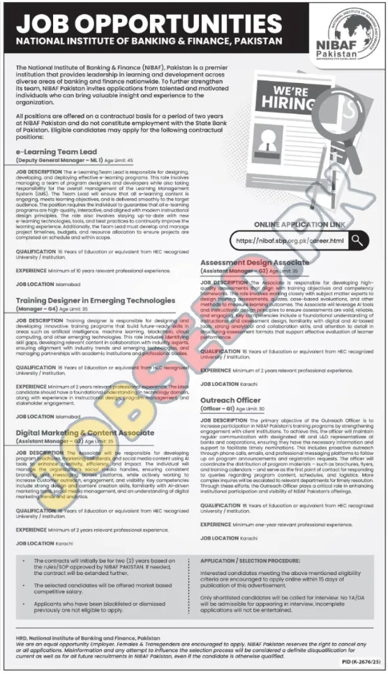 Explore exciting career opportunities at the National Institute of Banking & Finance (NIBF) in Pakistan. NIBF is hiring for several key positions, including e-Learning Team Lead, Training Designer, Digital Marketing Associate, Assessment Design Associate, and Outreach Officer. These contractual roles require candidates with 16 years of education and relevant experience in fields such as digital marketing, emerging technologies, and banking outreach. Apply online for these latest government sector jobs in Karachi and Islamabad.