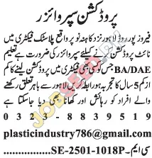 Night Production Supervisor Needed at Plastic Factory in Lahore
