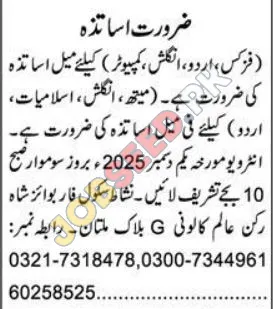 Nishat Boys High School, Multan Punjab Pakistan invites applications from eligible candidates for the post of Lecturer as per advertisement of 01 December, 2025, published in Express Newspaper. Master educational qualification will be preferred.