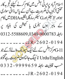 A private sector organization in Islamabad is currently seeking dedicated individuals for various office support roles. We have immediate openings for experienced office assistants and skilled data entry operators. The first position requires candidates to have their own transportation and be familiar with areas like F Sector, G Sector, Margalla Enclave, and DHA. Compensation for this role is based on either a fixed salary or commission. The second opportunity, located in G-11 Markaz, is for a data entry specialist proficient in both Urdu and English typing. These positions offer competitive compensation and a chance for professional growth within a dynamic environment.
