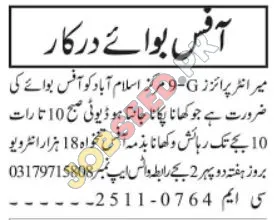 Mir Enterprises in G-9 Markaz, Islamabad, is seeking a reliable and diligent Office Boy to join their team. This is an excellent opportunity for a hardworking individual with basic cooking skills. The ideal candidate should be responsible, punctual, and able to handle day-to-day office tasks effectively.