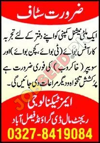A leading multinational company, Aims Technology, has announced immediate job openings for support staff in Faisalabad. The company is seeking experienced individuals to fill key roles as Office Boy and Sweeper. These positions offer a competitive salary and benefits package for candidates who demonstrate reliability and a strong work ethic. This is a valuable opportunity to secure stable employment within a reputable private sector organization.