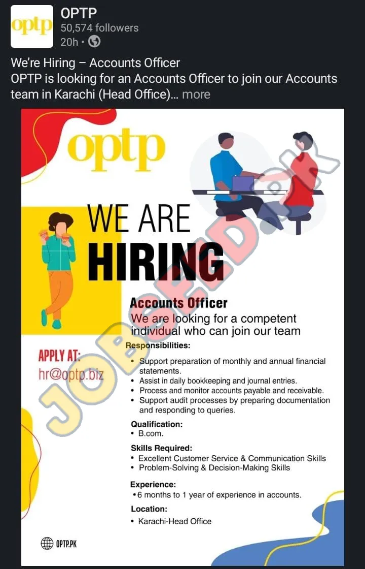 OPTP is currently seeking a skilled Accounts Officer to join our dynamic team in Karachi. This is a fantastic opportunity for individuals looking to advance their career in the accounting field. The ideal candidate should be competent and ready to contribute to our accounts team.