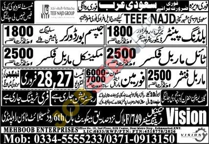 TEEF NAJD GROUP, a leading overseas employment facilitator, is announcing exciting career prospects in Saudi Arabia. This recruitment drive focuses on filling essential roles within the construction and finishing sectors, offering a pathway to international career growth for skilled individuals. We are committed to connecting talented Pakistani workers with reputable employers in the Kingdom, ensuring fair employment practices and competitive compensation.