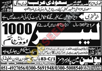Union Manpower Services, a leading private sector recruitment agency, has announced new job openings for general laborers in Saudi Arabia. These positions offer immediate departure for selected candidates. The advertisement highlights a competitive salary package of 1000 Saudi Riyals per month, along with additional overtime benefits. This is an excellent opportunity for individuals seeking stable employment and career growth in the Middle East.