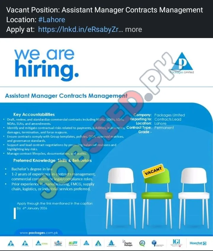 Packages Limited, Lahore invites applications from eligible candidates for the post of Assistant Manager Contracts Management as per advertisement of 28 December, 2025, published in LinkedIn. LLB educational qualification will be preferred.