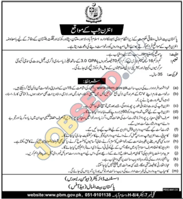 Pakistan Bait-ul-Mal (PBM), a Federal Government organization, offers paid internship opportunities at their offices. PBM is inviting applications from eligible individuals seeking to gain experience and contribute to the social welfare sector across various cities like Islamabad, Lahore, Multan, Peshawar, Quetta and Gilgit-Baltistan. This is a good opportunity for career development. This position represents excellent career opportunities in the region. If you are seeking for a government job, then apply!