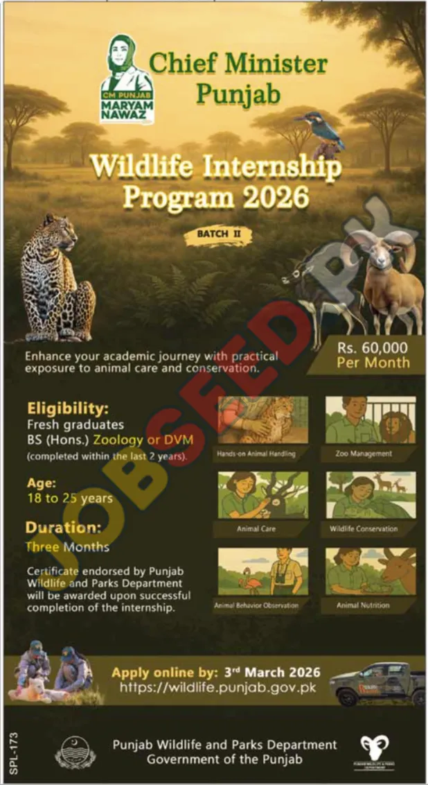 The Punjab Wildlife and Parks Department, operating under the Government of the Punjab, has announced a prestigious paid internship opportunity for fresh graduates. This initiative, titled the "Wildlife Internship Program 2026 Batch II," aims to provide practical experience in animal care and conservation within the public sector. Successful candidates will receive a competitive monthly stipend of Rs. Successful candidates will benefit from these government jobs. 60,000 for a three-month duration. This program offers an excellent chance for recent graduates in Zoology or DVM to gain valuable hands-on experience in wildlife preservation efforts and contribute to environmental protection in Pakistan. This position represents excellent immediate vacancies in the region. The internship focuses on practical training in areas such as zoo management, animal handling, and conservation techniques, preparing participants for future career opportunities in this specialized field.