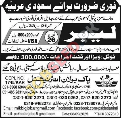 Pak Bolan International, Riyadh Saudi Arabia Pakistan invites applications from eligible candidates for the post of Labourer as per advertisement of 18 December, 2025, published in Express Newspaper. Primary educational qualification will be preferred.