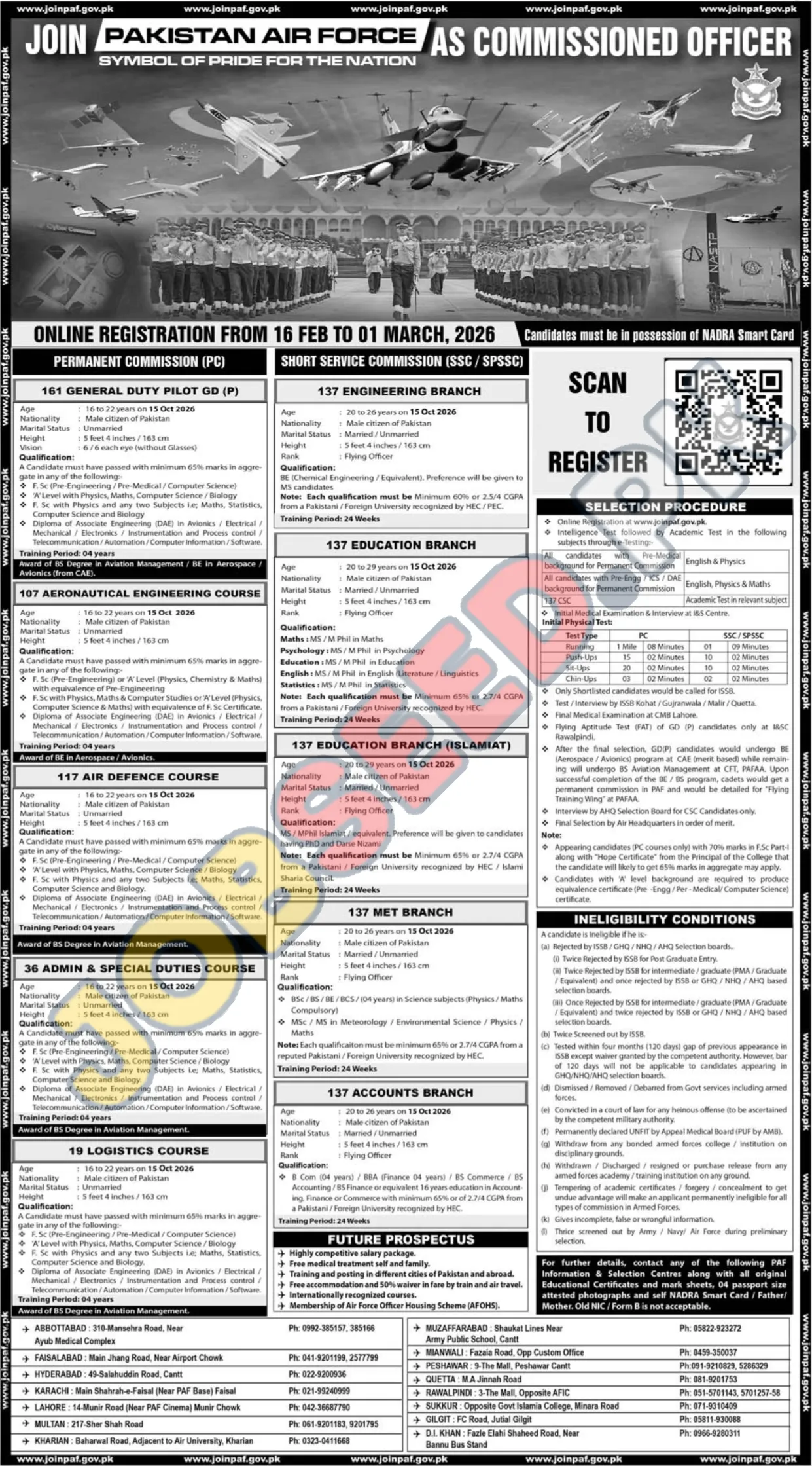- Contact Information: For further details, contact any of the following PAF Information & Selection Centres with all original educational certificates and mark sheets, 04 passport size attested photographs and self NADRA Smart Card / Father/ Mother, Old NIC/ Form B is not acceptable.