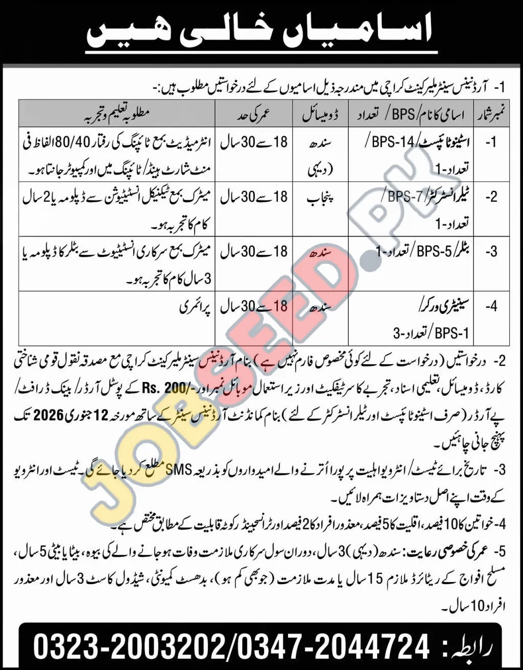 Pakistan Army, Karachi invites applications from eligible candidates for the post of Stenotypist, Tailor Instructor, Butler and Sanitary Worker as per advertisement of 28 December, 2025. Intermediate, Matric, Primary educational qualification will be preferred.