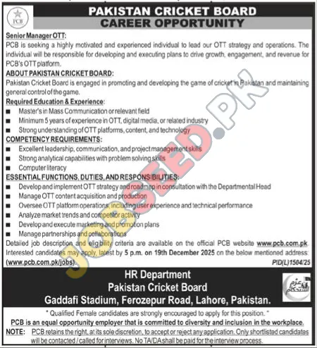 Pakistan Cricket Board PCB, Lahore Punjab Pakistan invites applications from eligible candidates for the post of Senior Manager OTT as per advertisement of 05 December, 2025. Master educational qualification will be preferred.