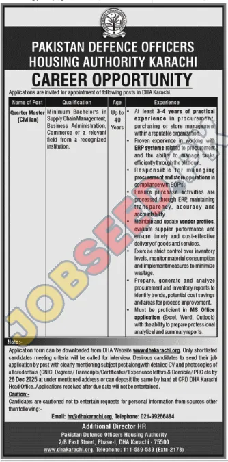 Pakistan Defence Officers Housing Authority, Karachi Sindh Pakistan invites applications from eligible candidates for the post of Quarter Master (Civilian) as per advertisement of 17 December, 2025, published in Nawaiwaqt Newspaper. Bachelor educational qualification will be preferred.