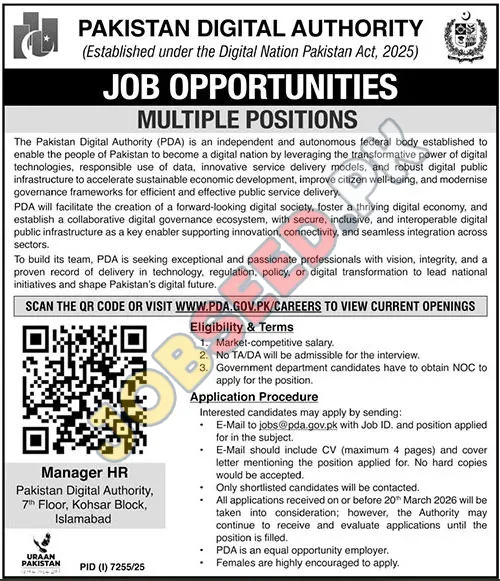 - Further Information: For current openings and detailed information, please scan the QR code provided or visit the official PDA careers website at www.pda.gov.pk/careers.