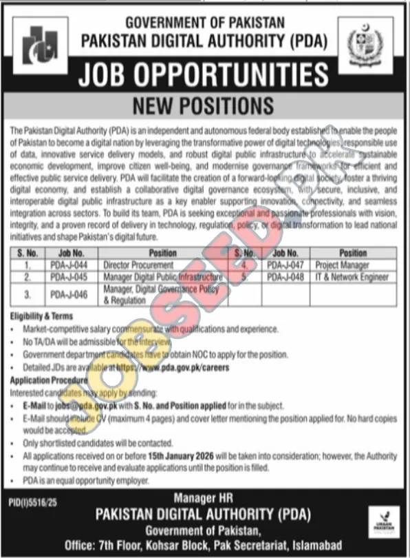 Apply at Pakistan Digital Authority (PDA), latest jobs in Management, Engineering, Procurement department before closing date which is around 15 January, 2026 or as per closing date in newspaper ad. Read complete ad online to know how to apply on latest Pakistan Digital Authority (PDA) job opportunities. For Further details visit https://www.jobseed.pk.