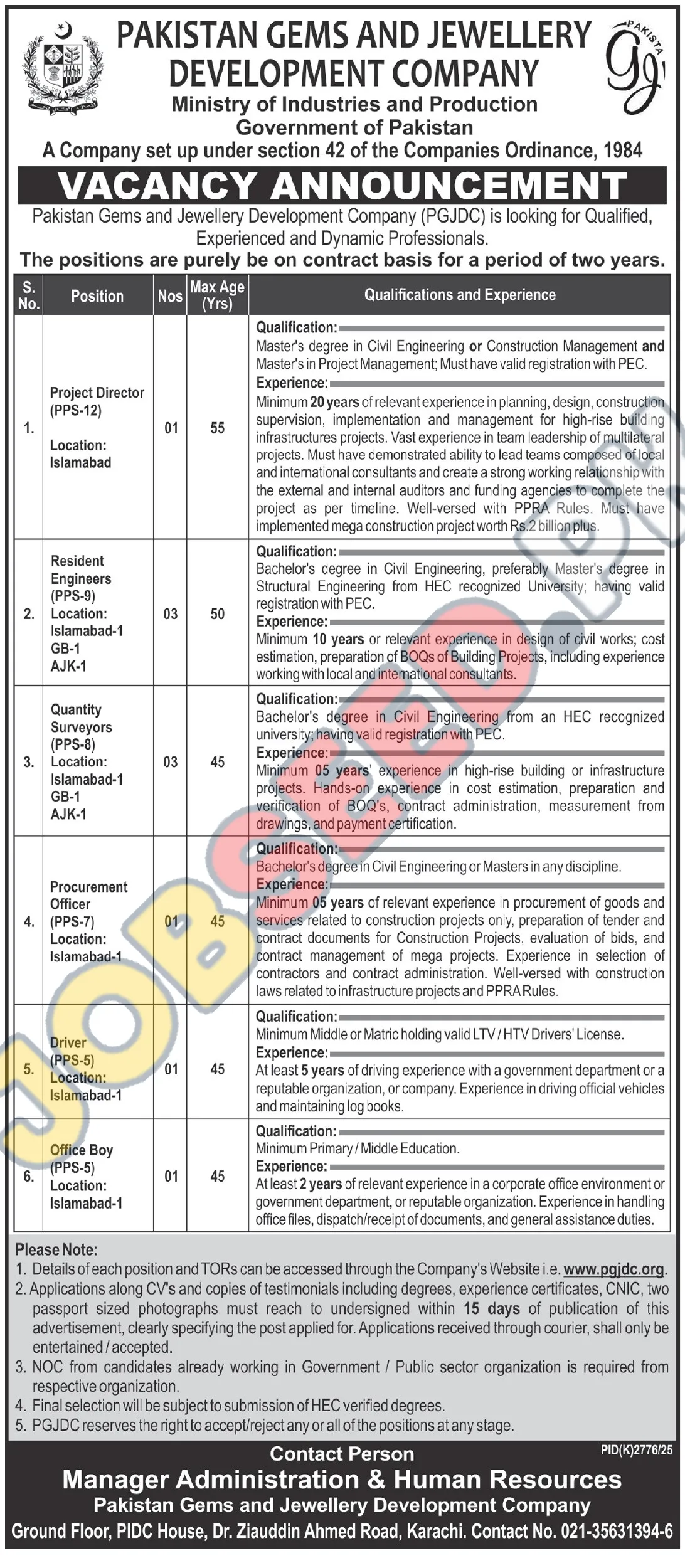 Government of Pakistan's Pakistan Gems and Jewellery Development Company (PGJDC) announces contract vacancies for experienced professionals. Seeking Master's/Bachelor's degree holders in Civil Engineering, Construction Management, and related disciplines for roles like Project Director, Resident Engineer, Quantity Surveyor, and Procurement Officer. Minimum 5-20 years of experience required for various positions. Opportunities for career growth in public sector development projects. High CPC