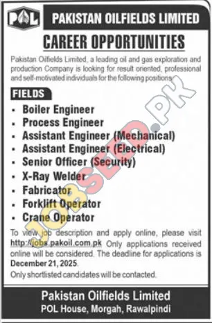 Pakistan Oilfields Limited POL, Rawalpindi Punjab Pakistan invites applications from eligible candidates for the post of Boiler Engineer, Process Engineer, Assistant Engineer (Mechanical), Assistant Engineer (Electrical), Senior Officer (Security), X-Ray Welder, Fabricator, Forklift Operator and Crane Operator as per advertisement of 14 December, 2025, published in Jang Newspaper. BE, Bachelor, Matric educational qualification will be preferred.