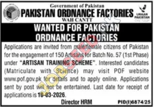 The esteemed Government of Pakistan, through its Pakistan Ordnance Factories (POF) located in Wah Cantt, is extending an invitation for skilled individuals to join its renowned 'Artisan Training Scheme'. This initiative, specifically Batch No. 57 (1st Phase), aims to onboard 150 male and female citizens of Pakistan, providing them with comprehensive training and practical experience. This is a significant opportunity for those seeking to build a stable career within a reputable government sector organization.
