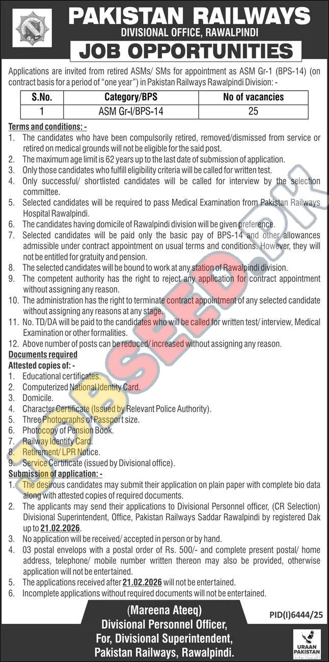 Pakistan Railways in Rawalpindi is inviting applications for the ASM Gr-I (BPS-14) position. This contract-based opportunity is open to retired ASMs/ SMs. Successful candidates will benefit from these latest jobs. Candidates with a domicile of Rawalpindi will be given preference to apply for these government jobs. The closing date for applications is 21 February, 2026. This is a great chance to work in the public sector.