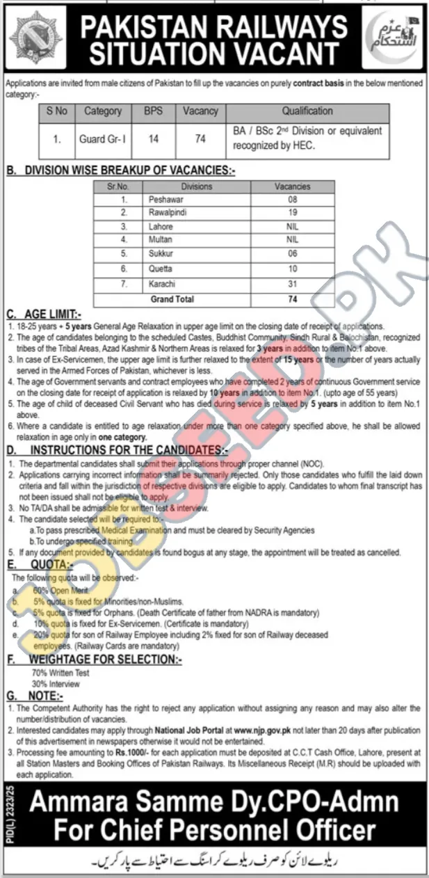 Pakistan Railways is actively seeking applications from eligible male citizens of Pakistan for numerous Guard Gr-I positions. This is a fantastic opportunity for individuals looking to join a prominent government sector organization and build a stable career. The recruitment process emphasizes merit and aims to fill 74 vacancies across various divisions. Successful candidates will benefit from a structured career path within a vital national service. Explore these latest government job openings in Pakistan and take a step towards professional growth.