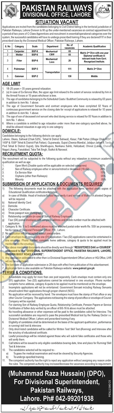 - Address for Application: Applications should be directly sent to: The Divisional Superintendent Office, Pakistan Railways, Lahore Division Bogy Road, Lahore.