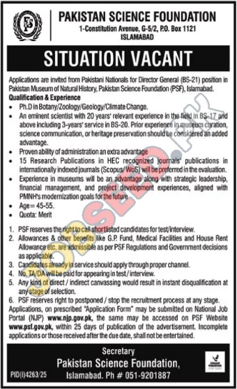 The Pakistan Science Foundation (PSF) is seeking a highly qualified and experienced individual to fill the position of Director General (BS-21) at the Pakistan Museum of Natural History in Islamabad. This is a unique opportunity to lead a prestigious institution and contribute significantly to the field of natural sciences.