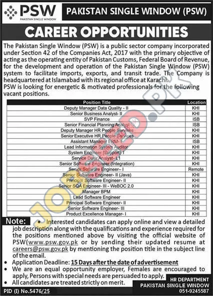 Pakistan Single Window, Karachi invites applications from eligible candidates for the post of Deputy Manager Data Quality - II, Senior Business Analyst - II, SVP Finance, Senior Financial Planning Analyst, Deputy Manager HR People Services, Senior Executive HR People Services, Assistant Manager ERM - I, Lead Information System Auditor, System Engineer (Support) - I, Service Desk Analyst - L1, Senior Software Engineer (Integration), Senior Software Engineer - I, Senior Software Engineer - II (Java), Principal Software Engineer - II, Senior SQA Engineer - III (WebOC 2.0), Manager BPM, Lead Software Engineer, Principal Software Engineer - II, Senior Software Engineer - III and Product Excellence Manager - I as per advertisement of 07 January, 2026. Bachelor educational qualification will be preferred.