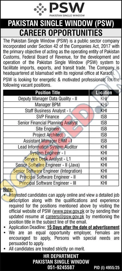 Pakistan Single Window PSW, Islamabad Islamabad Pakistan invites applications from eligible candidates for the post of Deputy Manager Data Quality - II, Manager BPM, Staff Business Analyst - I, SVP Finance, Senior Financial Planning Analyst, Site Engineer, Project Architect, Assistant Manager ERM - I, Lead Information System Auditor, System Engineer - I, Service Desk Analyst - L1, Senior Software Engineer - II (Java), Senior Software Engineer (Integration), Principal Software Engineer - II and Principal Software Engineer - III as per advertisement of 18 December, 2025. Master, Bachelor educational qualification will be preferred.