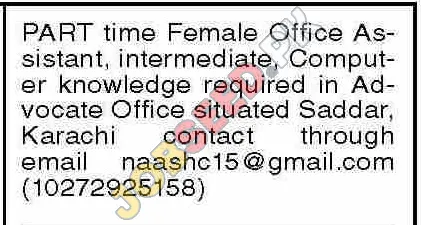 This advertisement seeks a part-time Female Office Assistant with intermediate education and computer skills for an advocate's office in Saddar, Karachi. Ideal for individuals seeking entry-level administrative roles in the legal sector. Explore this local job opening for a chance to gain valuable experience.