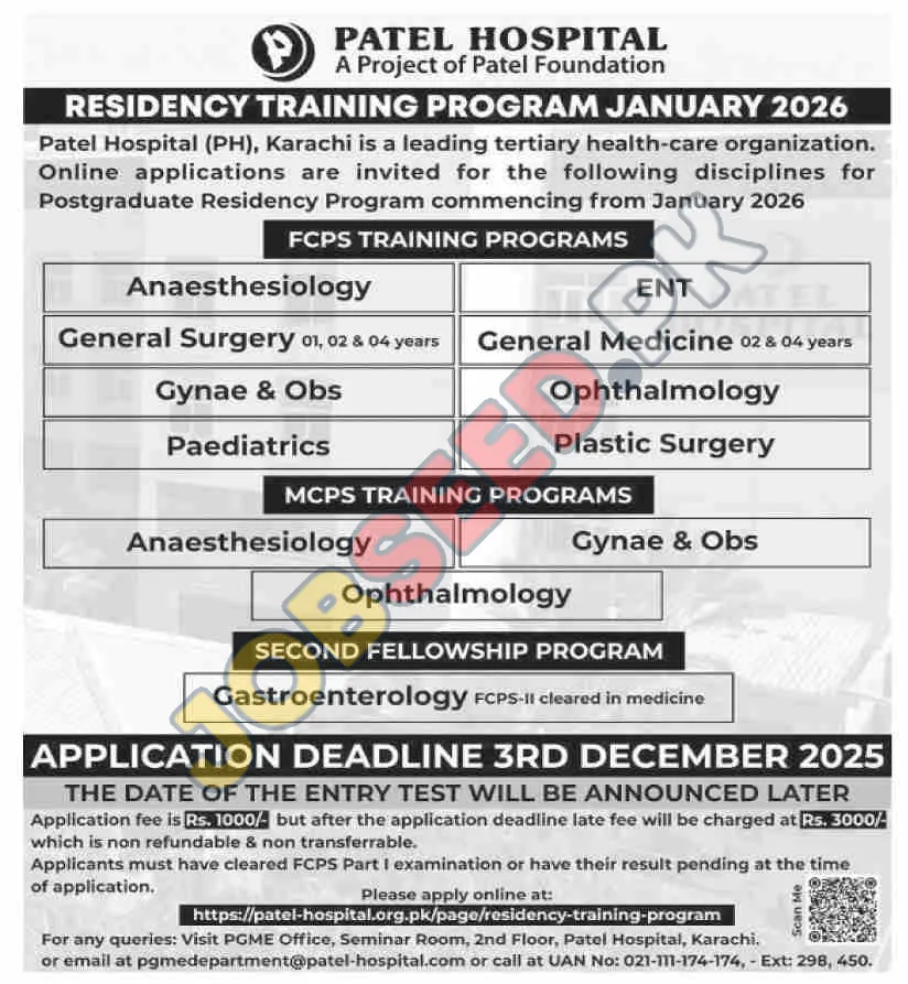 Patel Hospital PH, Karachi Sindh Pakistan invites applications from eligible candidates for the post of Anaesthesiology (FCPS Training Program), ENT (FCPS Training Program), General Surgery (FCPS Training Program), General Medicine (FCPS Training Program), Gynae & Obs (FCPS Training Program), Ophthalmology (FCPS Training Program), Paediatrics (FCPS Training Program), Plastic Surgery (FCPS Training Program), Anaesthesiology (MCPS Training Program), Gynae & Obs (MCPS Training Program), Ophthalmology (MCPS Training Program) and Gastroenterology (Second Fellowship Program) as per advertisement of 02 November, 2025, published in Dawn Newspaper. MBBS educational qualification will be preferred.