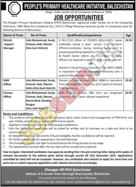Peoples Primary Healthcare Initiative, Quetta Balochistan Pakistan invites applications from eligible candidates for the post of District Support Manager, M&E Officer and Finance Officer as per advertisement of 26 November, 2025, published in Jang Newspaper. Bachelor, Master, BA educational qualification will be preferred.