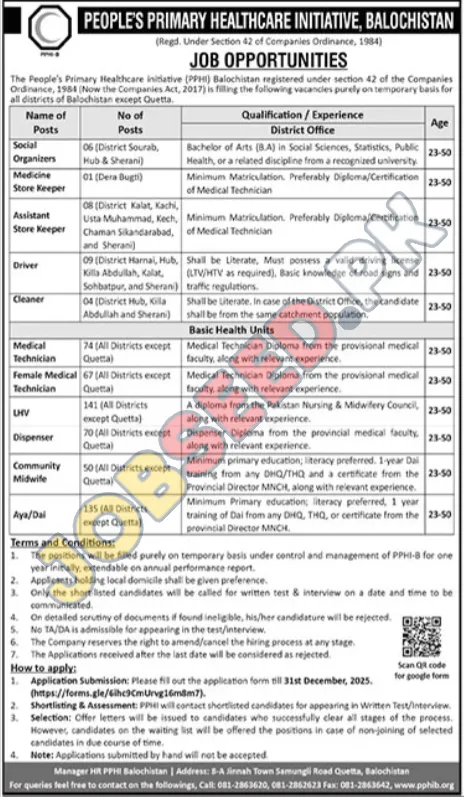 Peoples Primary Healthcare Initiative, Quetta Balochistan Pakistan invites applications from eligible candidates for the post of Social Organizers, Medicine Store Keeper, Assistant Store Keeper, Driver, Cleaner, Medical Technician, Female Medical Technician, LHV, Dispenser, Community Midwife and Aya/Dai as per advertisement of 16 December, 2025, published in Jang Newspaper. BA, Matric, Literate, Diploma, Primary educational qualification will be preferred.