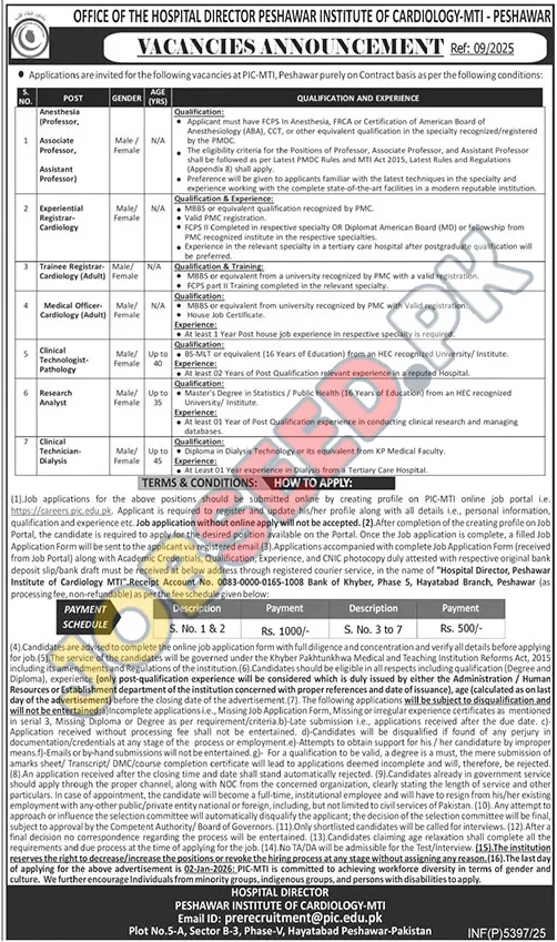 Peshawar Institute of Cardiology PIC, Peshawar Khyber Pakhtunkhwa KPK Pakistan invites applications from eligible candidates for the post of Anesthesia (Professor), Associate Professor, Assistant Professor, Experiential Registrar-Cardiology, Trainee Registrar-Cardiology (Adult), Medical Officer- Cardiology (Adult), Clinical Technologist-Pathology, Research Analyst and Clinical Technician-Dialysis as per advertisement of 19 December, 2025, published in Express Newspaper. Master, MBBS, BS, Diploma educational qualification will be preferred.