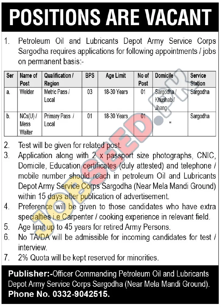 Contact Information: For any queries, contact Officer Commanding Petroleum Oil and Lubricants Depot Army Service Corps Sargodha at Phone No. 0332-9042515.