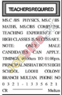 Latest Teaching Vacancies at Nishat Boys High School, Multan