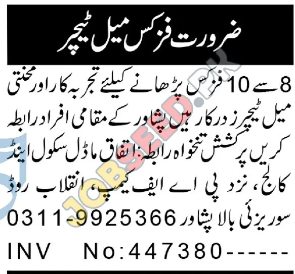 Ittefaq Model School & College is now recruiting in Peshawar Khyber Pakhtunkhwa. Apply for the position of Physics Teacher. The required qualification is Bachelor. This role is within the Teaching industry. A bachelor degree is preferred. The application process commenced on 25 November, 2025 via Aaj Newspaper. Interested and eligible candidates must submit their applications before the deadline on 13 December, 2025. This is a prime opportunity to join a renowned organization. For a step-by-step application guide and full eligibility criteria, please see the official advertisement on https://www.jobseed.pk.