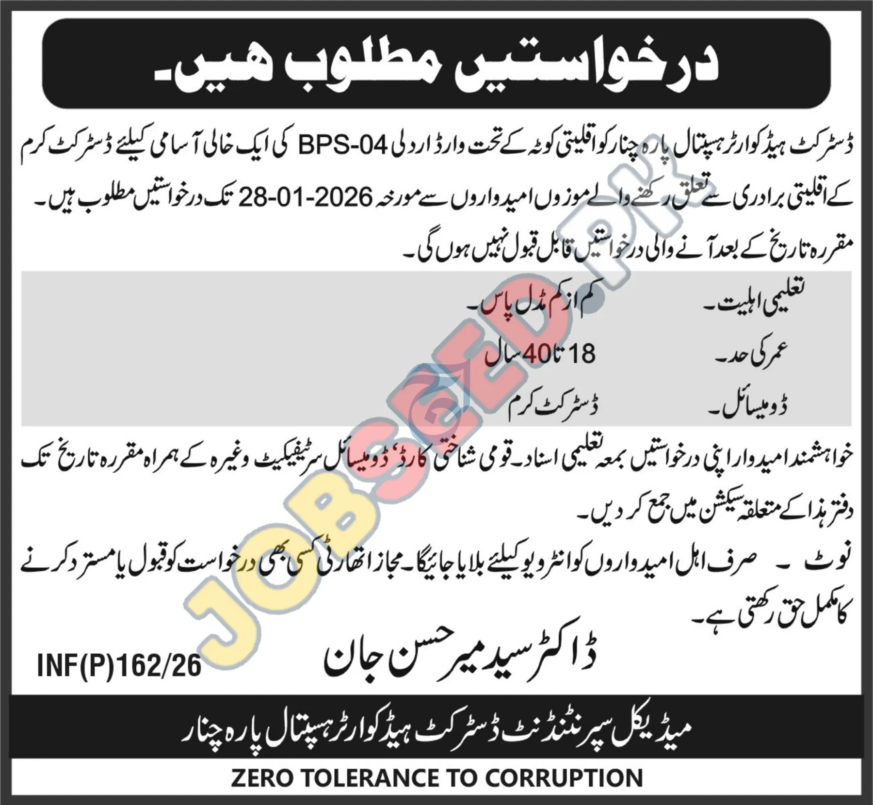 Pakistan Institute of Medical Sciences (PIMS), Islamabad invites applications from eligible candidates for the post of Stenotypist, Data Entry Operator, Librarian, Junior Technician, Store Keeper, Telephone Operator, Driver, Naib Qasid, Chowkidar, Mali and Sanitary Worker as per advertisement of 14 January, 2026. Intermediate, Master, Middle educational qualification will be preferred.