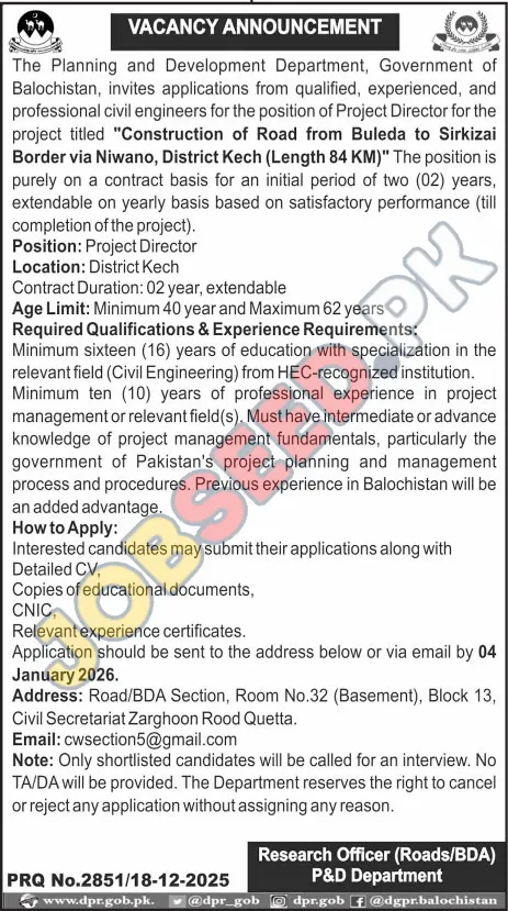 Planning & Development Department, Kech Balochistan Pakistan invites applications from eligible candidates for the post of Project Director as per advertisement of 19 December, 2025. Bachelor educational qualification will be preferred.
