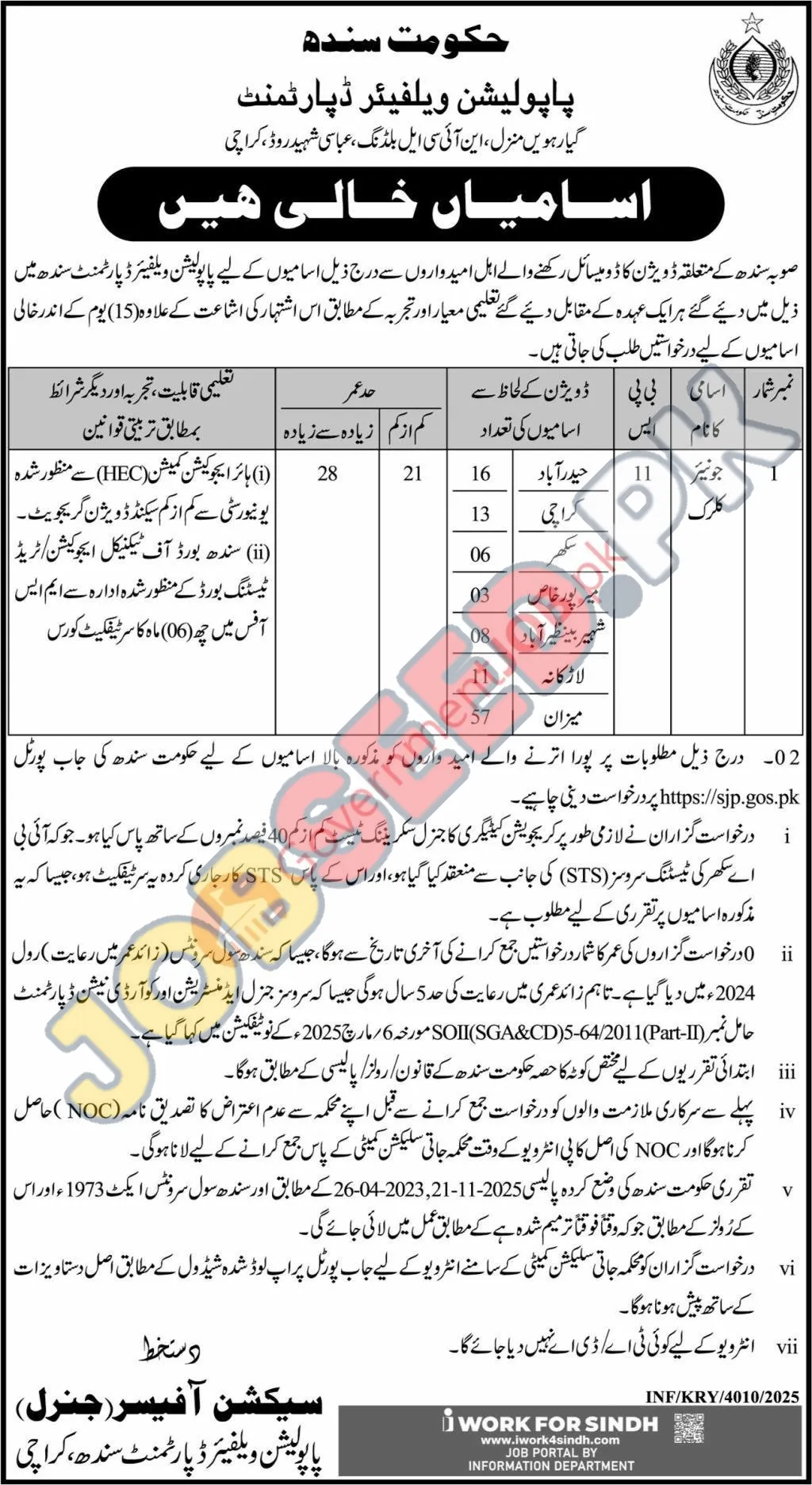 Population Welfare Department Sindh, Karachi invites applications from eligible candidates for the post of Junior Clerk as per advertisement of 29 November, 2025. Bachelor educational qualification will be preferred.