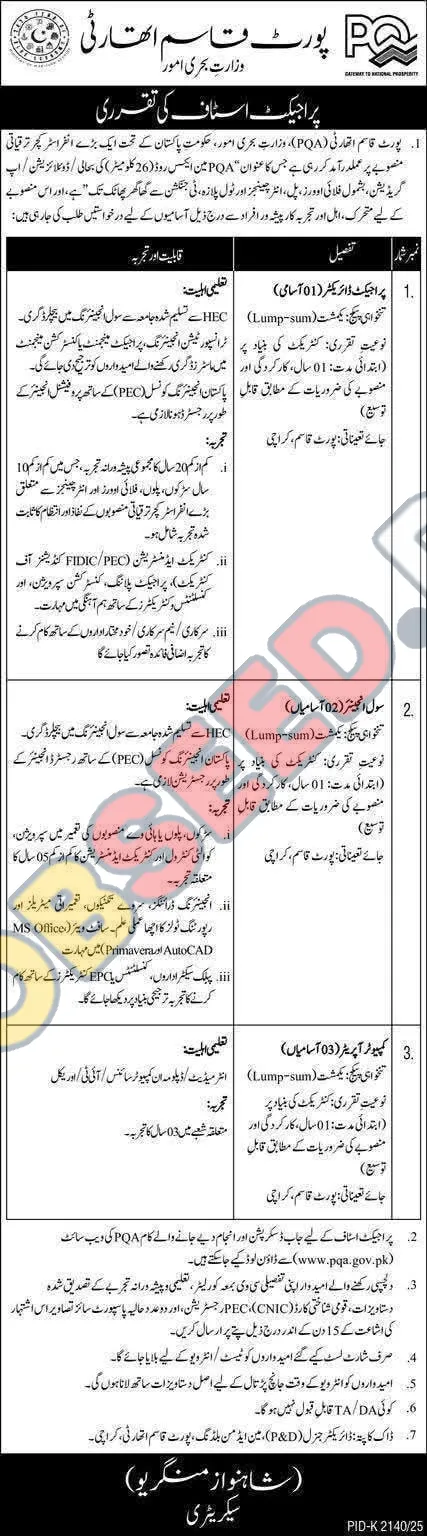 Join the team at Port Qasim Authority (PQA) in Karachi, Sindh. They are seeking to hire 3 qualified individuals for the roles of Project Director, Civil Engineer and Computer Operator. This is a contract position. This career opportunity was advertised on 26 December, 2025. The last date to apply is 01 January, 2026. Don't miss this chance to advance your career with Port Qasim Authority (PQA). For more information and to apply online, visit https://www.jobseed.pk.