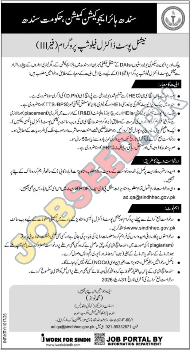 The Sindh Higher Education Commission (Sindh HEC), a prominent government organization, is actively seeking applications for its Postdoctoral Fellowship Program (Phase III). This esteemed program is designed to empower scholars and researchers from both public and private sector universities, as well as recognized institutions, to engage in advanced research and development. These government jobs offer a unique opportunity for individuals to elevate their academic careers and contribute significantly to the research landscape of Pakistan.