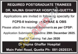 Career opportunity at Dr Najma Ghaffar Hospital located in Quetta Balochistan Pakistan for the position of Postgraduate Trainee. This employment notice was announced on 03 December, 2025 through Jang Newspaper. Candidates possessing a MBBS degree are encouraged to submit their application.