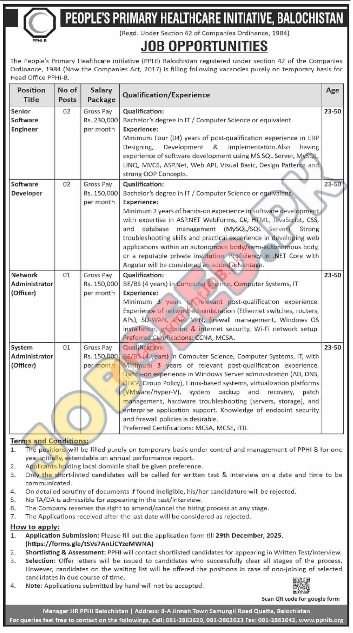 PPHI Balochistan, Quetta invites applications from eligible candidates for the post of Senior Software Engineer, Software Developer, Network Administrator (Officer) and System Administrator (Officer) as per advertisement of 13 December, 2025. Bachelor, BE educational qualification will be preferred.