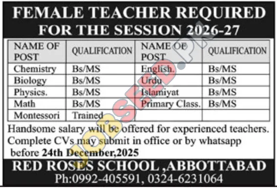 Red Roses School in Abbottabad is seeking enthusiastic and dedicated teachers for the upcoming session 2026-27. We are looking for qualified individuals to fill various teaching roles across different subjects and grade levels. If you are passionate about education and committed to fostering a positive learning environment, we encourage you to apply.