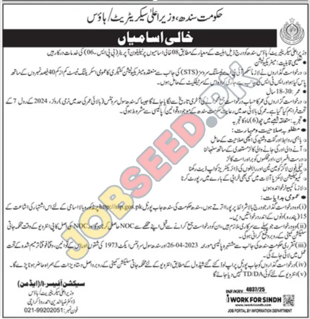 Join the team at Prime Minister Secretariat in Karachi, Sindh. They are seeking to hire a Prime Minister Secretariat. This is a Full-Time position. This career opportunity was advertised on 03 December, 2025 in Jang Newspaper. The last date to apply is 18 December, 2025. Don't miss this chance to advance your career with Prime Minister Secretariat. For more information and to apply online, visit https://www.jobseed.pk.