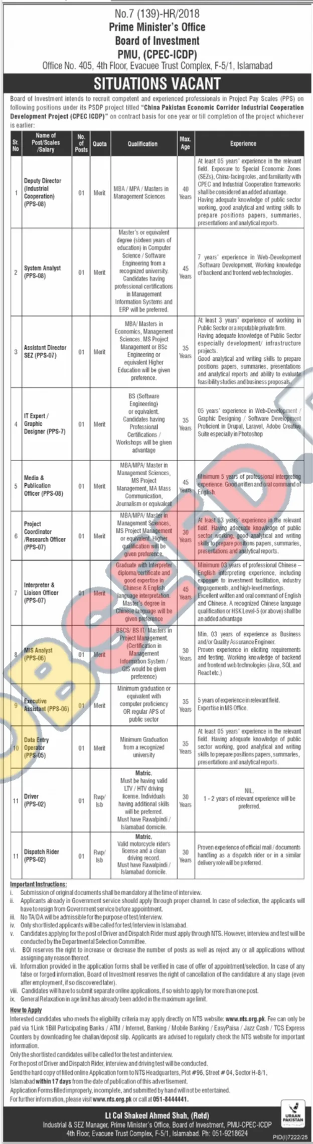 Explore exciting government job opportunities within the Prime Minister's Office, Board of Investment, for the China Pakistan Economic Corridor Industrial Cooperation Development Project (CPEC-ICDP). This is a prime chance for experienced professionals to contribute to a significant national initiative. We are seeking skilled individuals for various positions on a contract basis, offering a platform for professional growth and impactful work in a government sector environment. Discover your next career move in public administration and project management.