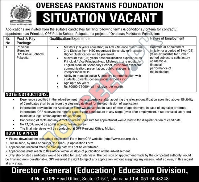 The Overseas Pakistanis Foundation is seeking qualified and experienced individuals to fill the position of Principal at OPF Public School, Pakpattan. This role offers an exciting opportunity to lead and manage a key educational institution within the OPF network.