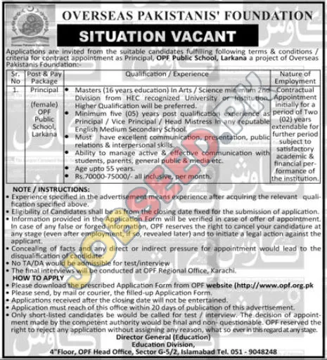 Overseas Pakistanis' Foundation is seeking a qualified and experienced Principal for their Public School in Larkana. This is a contractual appointment with an initial period of two years, extendable based on performance.
